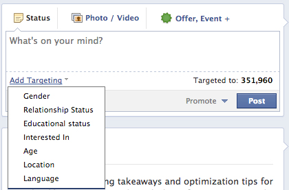 Вы можете добиться большего от вашей бизнес-страницы в Facebook, таргетируя посты с учетом различных типов людей, составляющих вашу аудиторию. Предположим, вы продаете дезодоранты. У вас есть линейка товаров для женщин, и линейка товаров для мужчин. И, рекламируя женский дезодорант, вы можете избежать раздражения со стороны мужской части аудитории, публикуя таргетированные посты. Все, что вам для этого нужно, это написать пост и кликнуть на значок местоположения. Появится надпись «Добавить таргетинг» и список категорий, по которым вы можете таргетировать.
