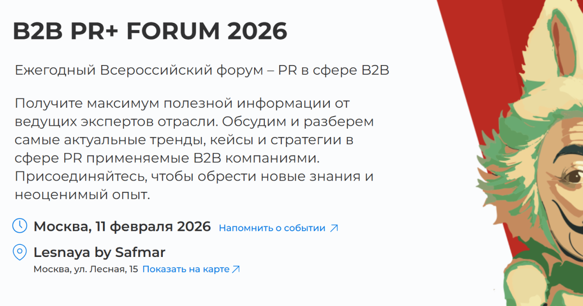 Тематика: отраслевой форум, посвященный PR и комплексным коммуникациям в сфере B2B и для холдингов. Мероприятие для директоров по связям с общественностью, руководителей пресс-служб, специалистов по GR и маркетингу.