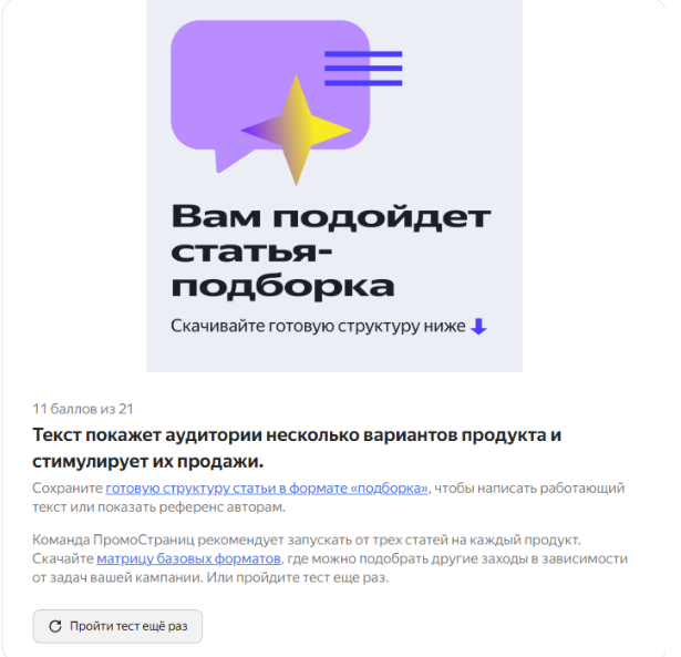 Помимо привлечения аудитории одной из задач также были и продажи. Поэтому тексты писали в формате подборки товаров, отказавшись от экспериментов с юзкейсами и нативными статьями. На всякий случай сверились с «Aкинатором форматов» — инструментом внутри рекламного кабинета «ПромоСтраниц», который подтвердил решение.