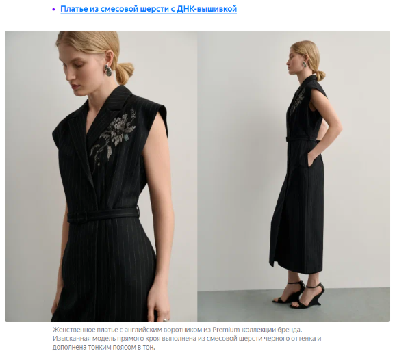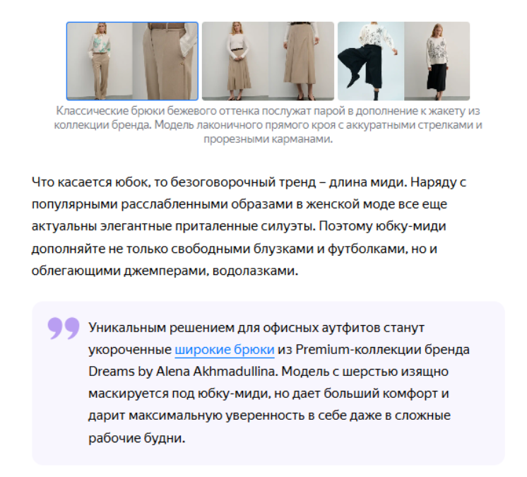 В качестве иллюстраций и примеров аутфитов использовали креативы из карточек товаров на сайте с текстовыми описаниями моделей и ссылками.