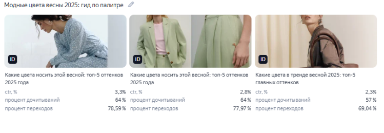 По итогам первого месяца в лидеры по конверсии в корзину и доходу вышли две статьи: «Секреты создания идеального летнего гардероба» и «Коллекция Весна-Лето’25 от Dreams by Alena Akhmadullina».