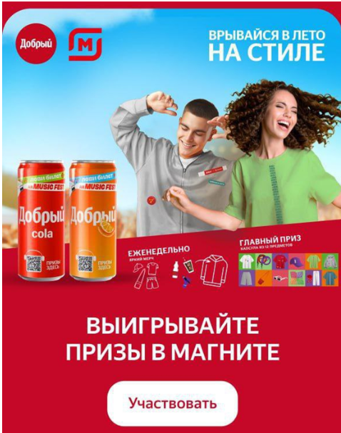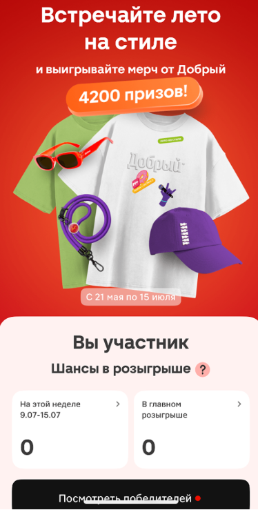 Проект нацелен не только на стимулирование продаж напитков «Добрый» в «Магните», но и на вовлечение молодежи. Кампания «Встречайте лето на стиле» с общим призовым фондом более 4,2 тыс. единиц мерча стала заметным акцентом в приложении «Магнита».