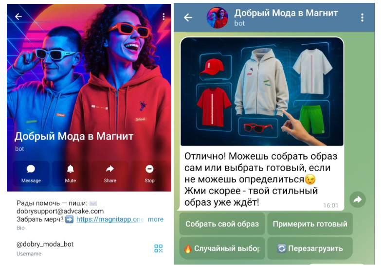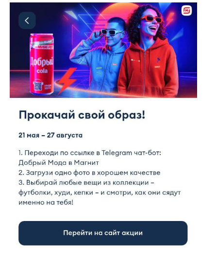 Пользовательскую механику встроили в мобильное приложение ретейлера: покупатели «Добрый Кола» регистрировались в акции, копили шансы на выигрыш и получали бонус — возможность создать собственный образ через телеграм-бота @dobry_moda_bot.