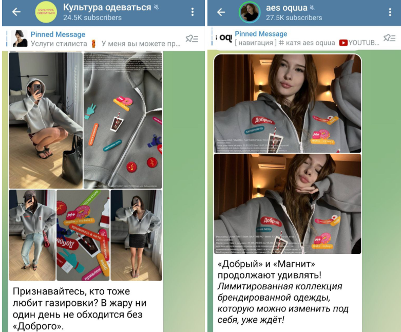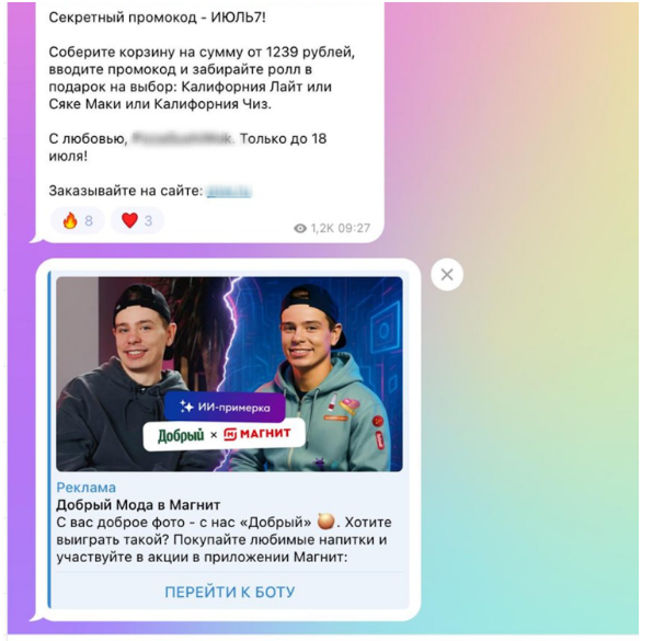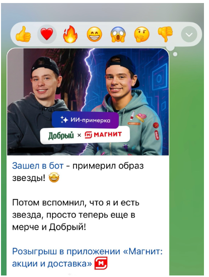 Размещение у блогеров. Проект дополнительно продвигали среди инфлюенсеров в «Телеграме» — блогеры получали фирменный мерч, рассказывали о нем подписчикам и предлагали перейти на страницу с акцией в приложении «Магнита». Эти размещения позволили охватить 5,2 млн пользователей.