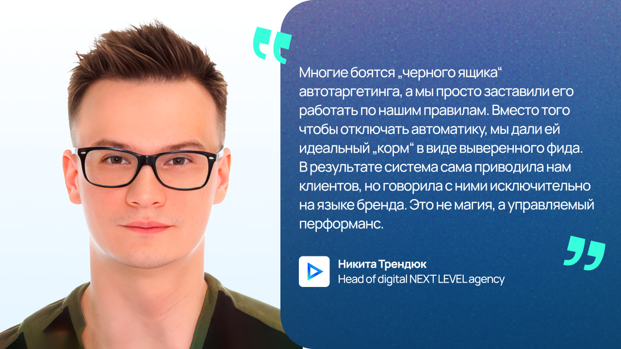 Ключевым фактором успеха стало то, как ручной стратегический контроль (через кастомный фид) был интегрирован с автоматическими алгоритмами «Яндекса». Такой подход позволил использовать все возможности автотаргетинга, не отдавая его на откуп «черному ящику», и гарантировать 100% соответствие объявлений позиционированию премиального бренда.