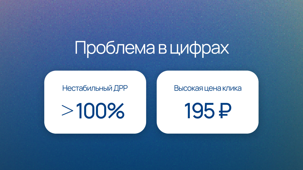 Аналитика показала, что ключевой проблемой была высокая стоимость клика (CPC), которая на пике достигала 195 руб. Это не позволяло выкупать достаточный объем трафика для получения необходимого количества конверсий.