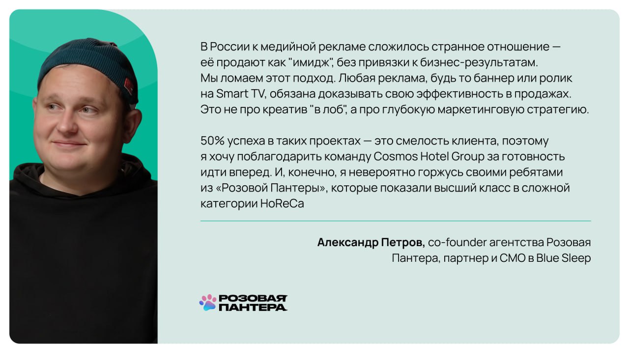 Креативы не были универсальными. Для каждого отеля линейки Selection разработали собственную визуальную концепцию с упором на уникальную атмосферу, интерьеры и локальный колорит (будь то Cosmos Selection Grozny или Cosmos Selection Ulan-Ude). В субтитрах к видеороликам транслировали как общие ценности всей сети, так и УТП (уникальное торговое предложение) конкретного отеля, создавая многослойный образ бренда.