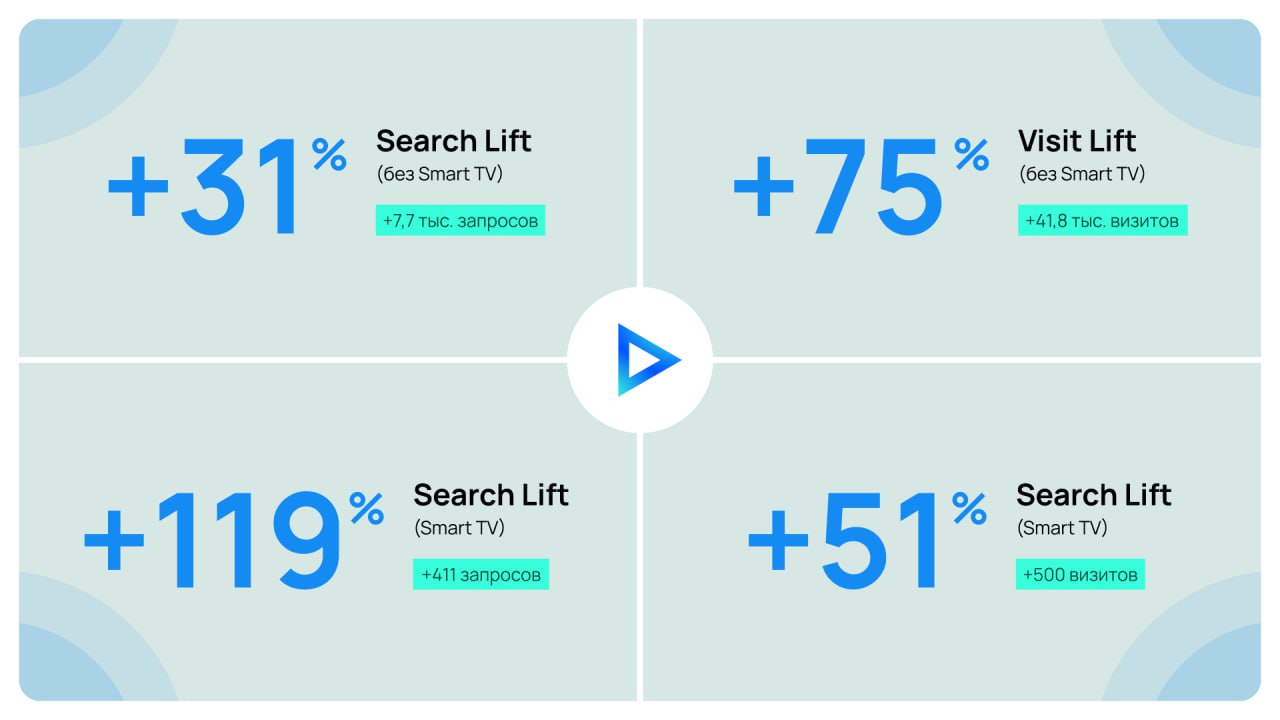 Эффективность кампании была подтверждена исследованием Brand Lift от «Яндекса». Эта технология измеряет реальное влияние рекламы, сравнивая поведение пользователей, видевших рекламу, с контрольной группой, которая ее не видела. Результаты этого исследования показали значительный прирост (Lift) по ключевым метрикам: Search Lift (рост поисковых запросов), Visit Lift (рост визитов) и Target Lift (рост целевых действий).