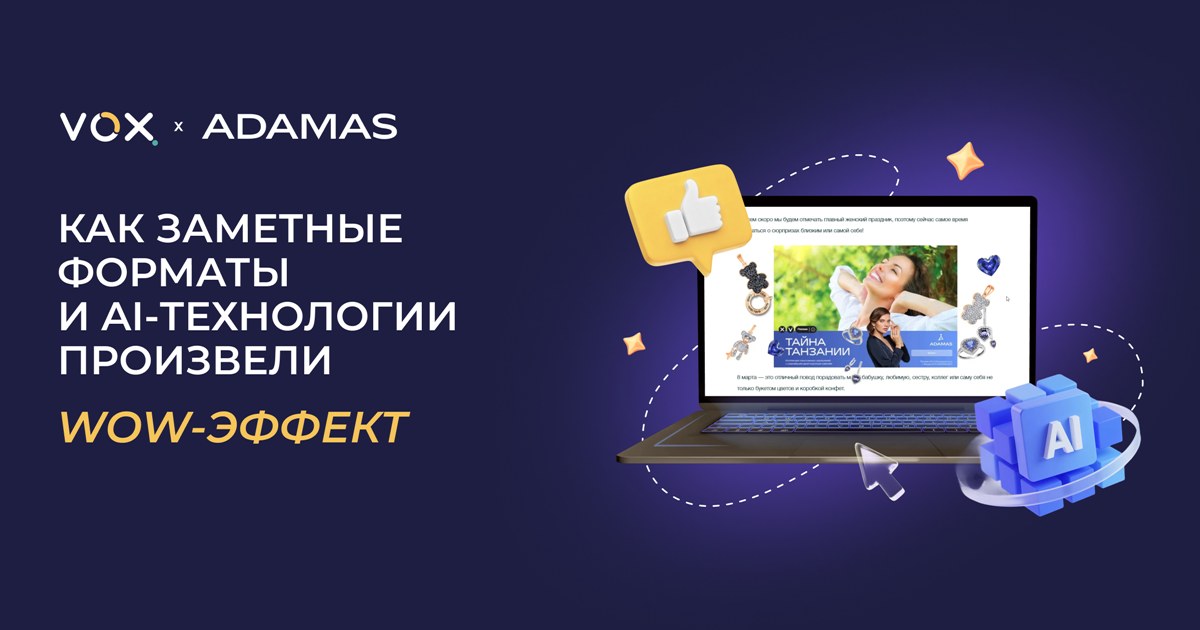 Рынок ювелирных изделий растет, но вместе с этим растет и конкуренция: десятки брендов борются за внимание аудитории, которая все чаще игнорирует стандартную рекламу. В таких условиях AI Vision рекламная платформа VOX (входит в состав AdTech-экосистемы Hybrid) вместе с ADAMAS решили пойти нестандартным путем — использовать искусственный интеллект, который адаптировал рекламу под стиль и возраст изображенных в контенте людей. Так, показатель ДРР (доля рекламных расходов) оказался лучше плана в 1,7 раза, а CR (Conversion Rate — коэффициент конверсии) превысил план в 2,7 раза.