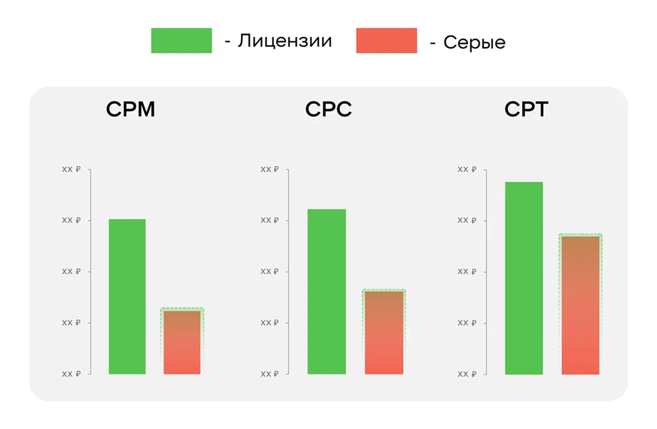 Лицензионные онлайн-кинотеатры продемонстрировали чуть более высокие медийные метрики — CTR 1,9% (Click-Through Rate — отношение числа кликов на рекламу к числу показов) и VTR 85% (View Through Rate — процент досматриваемости) против 1,7 и 83% у «серых». При этом «серые» кинотеатры остаются драйвером стоимости — CPM (Cost per Mille — стоимость 1 тыс. показов рекламного объявления) ниже на 45%, CPC — на 38% (Cost per Click — стоимость одного клика по рекламному баннеру или объявлению), а CPT — на 25%. Это подчеркивает различие в роли инвентаря — лицензии работают на качество взаимодействия, а «серые» дают масштаб за меньшую цену.
