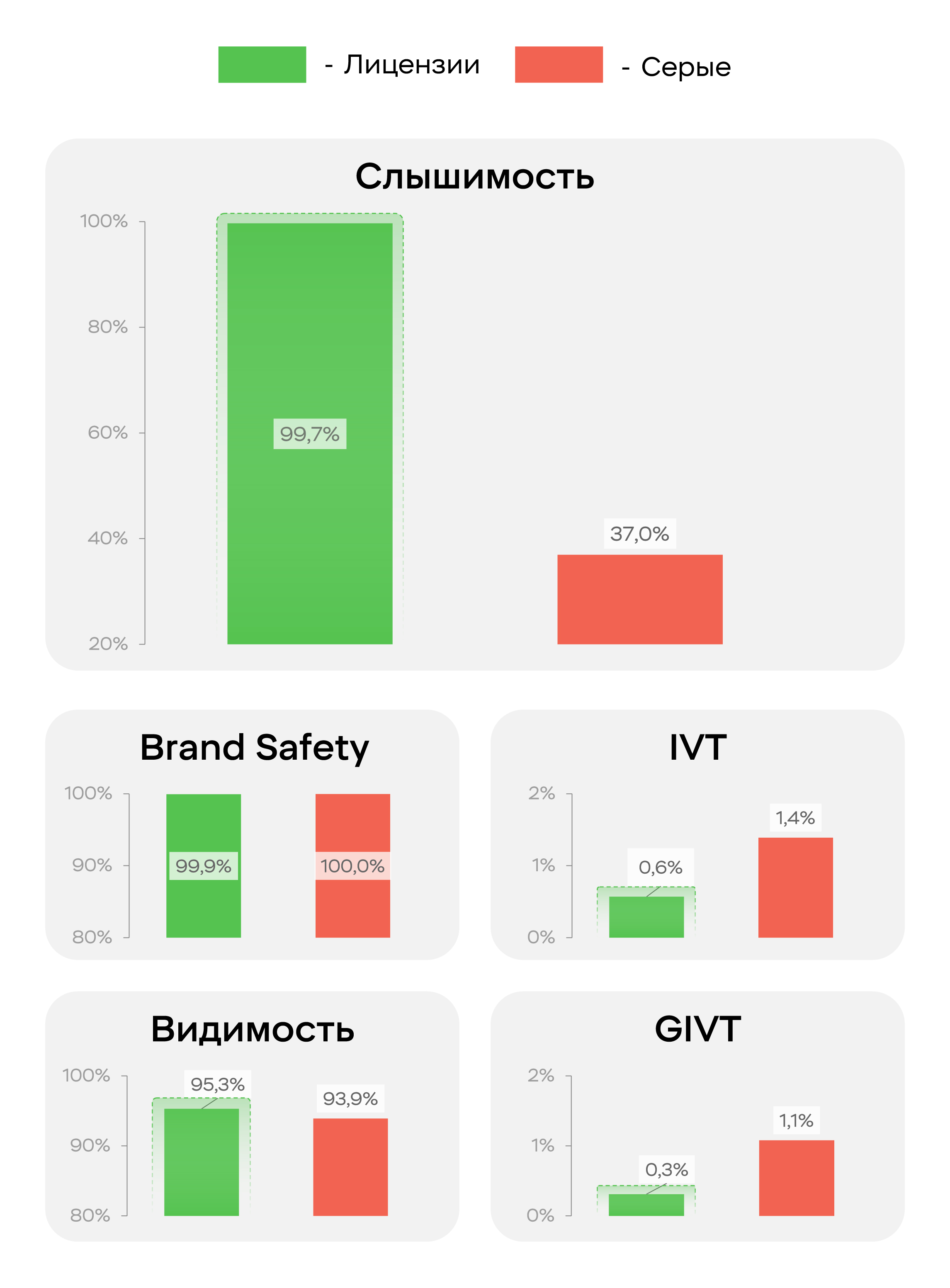 У лицензионных онлайн-кинотеатров более высокое качество показа — практически все рекламные показы были со звуком, видимость держалась выше 95%, уровень замеренного фрода (IVT) в 2 раза ниже. Обе категории обеспечили высокий 100% уровень Brand Safety. Таким образом, лицензионные кинотеатры дают по умолчанию высокий контроль, качество и чистоту окружения, а «серые» отстают в этом от них некритично в силу усиленной контролируемой среды.
