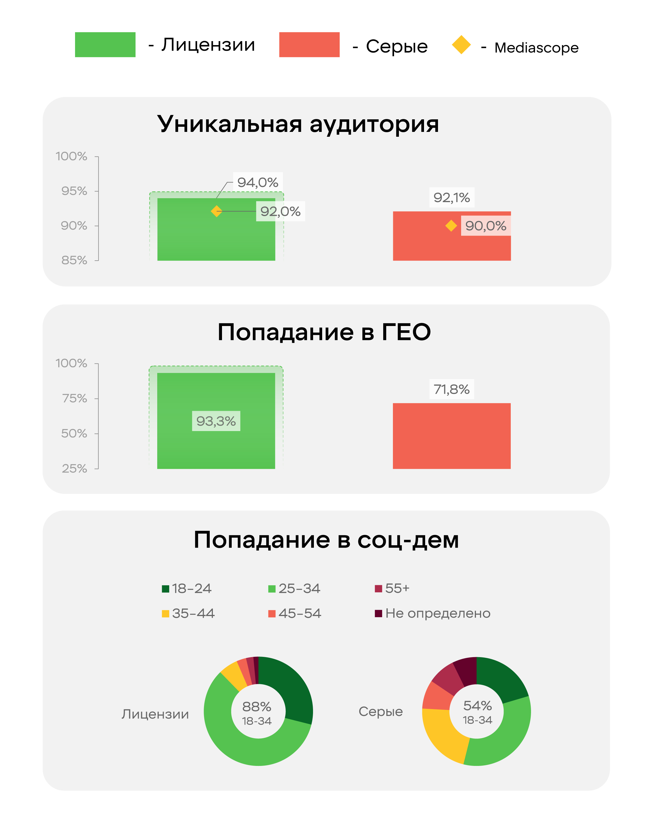 Замеренное пересечение аудиторий между лицензионными и «серыми» онлайн-кинотеатрами низкое, обе группы дают высокий уникальный охват — 94 и 92%. Лицензии точнее попали в целевое гео (93 против 72%) и целевой соцдем 18–34 (88 против 54%).
