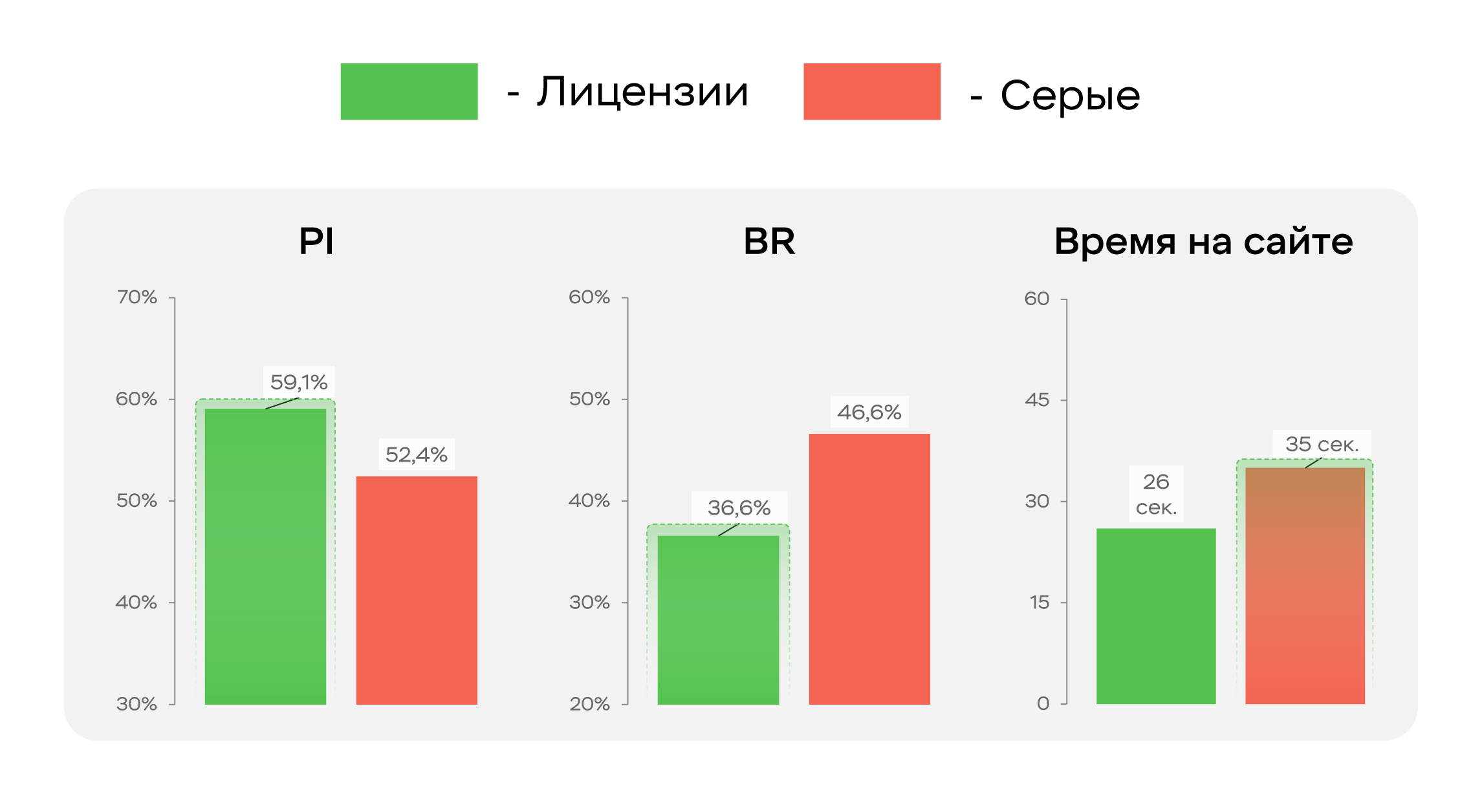Пользователи, пришедшие с лицензионных онлайн-площадок, взаимодействовали с сайтом активнее (выше PI и PCCR, ниже BR), что говорит о более глубоком качестве контакта. При этом уровень поствью-конверсий оказался практически идентичным, но ДРР выше у лицензий из-за более дорогого инвентаря.