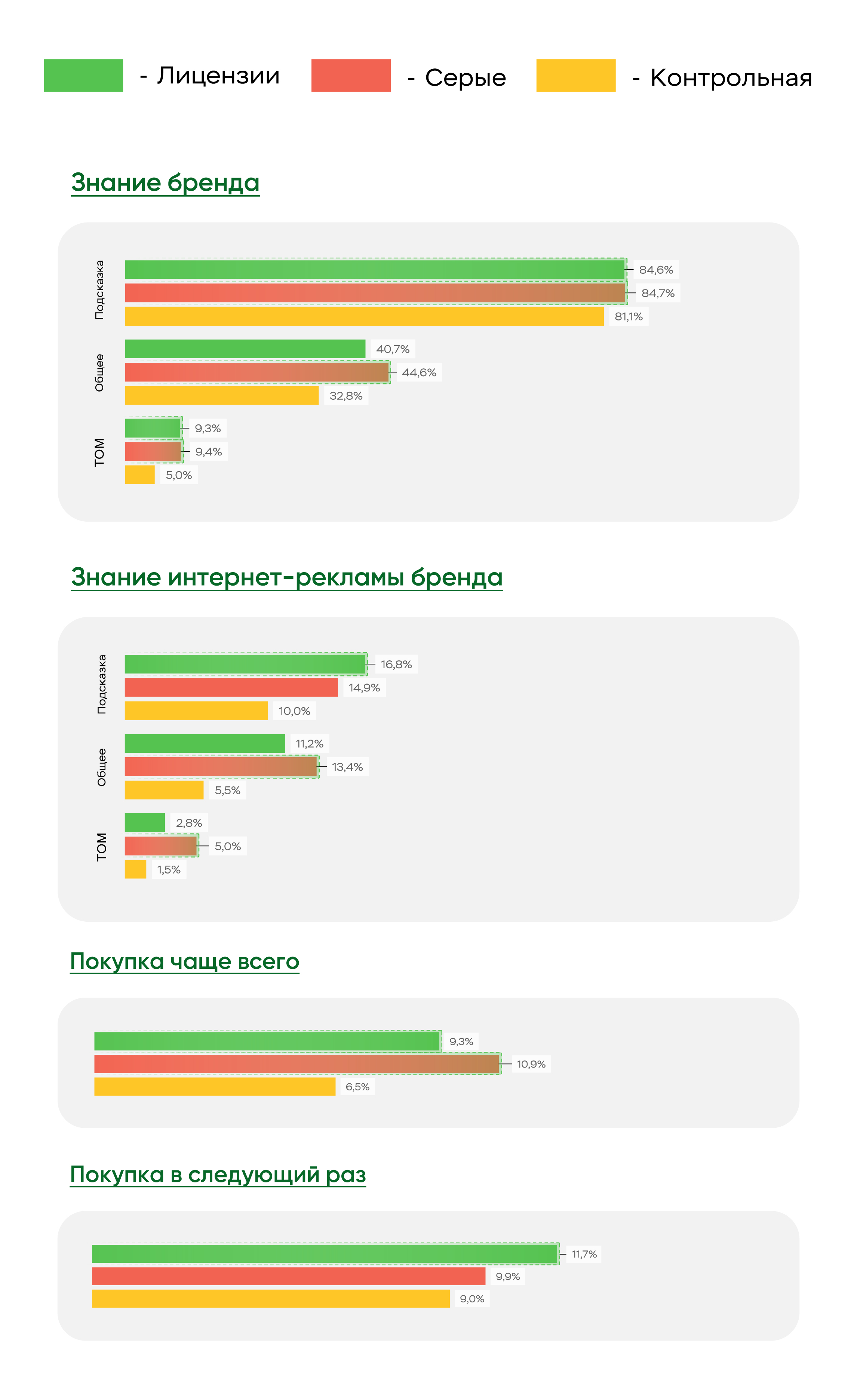 Примечание: механика Brand Lift — A/B-сравнение: группа контакта (ТС1 — лицензии, ТС2 — «серые») vs контроль; объемы: контакт 400 (200+200), контроль 200. Вопросы по метрикам: Покупка чаще всего — «В каком магазине розничной торговли Вы совершали покупки чаще всего?»; Покупка в следующий раз — «В каком магазине розничной торговли Вы совершите покупки в следующий раз?».