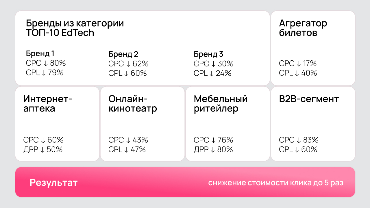 Подход был протестирован на клиентах из различных ниш — от рекламных технологий до электронной коммерции и диджитал-сервисов. Во всех проектах получили выраженное снижение CPC (Cost per Click — стоимость одного клика по рекламному баннеру или объявлению) и стоимости конверсий при сохранении или росте объема брендового трафика.