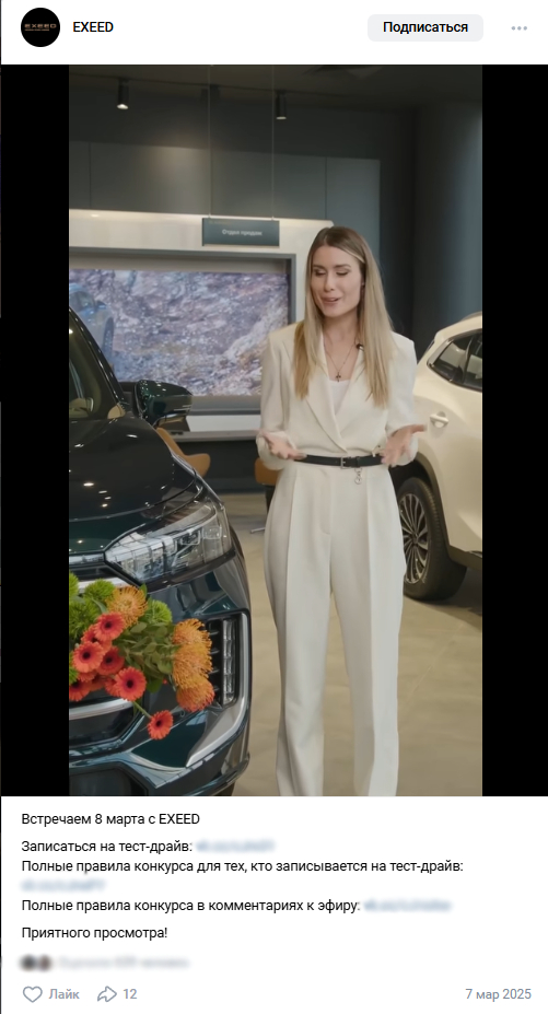 2. Повысить вовлеченность. Собрать просмотры, комментарии и реакции в официальных сообществах Exeed («ВКонтакте» и «Телеграм»).