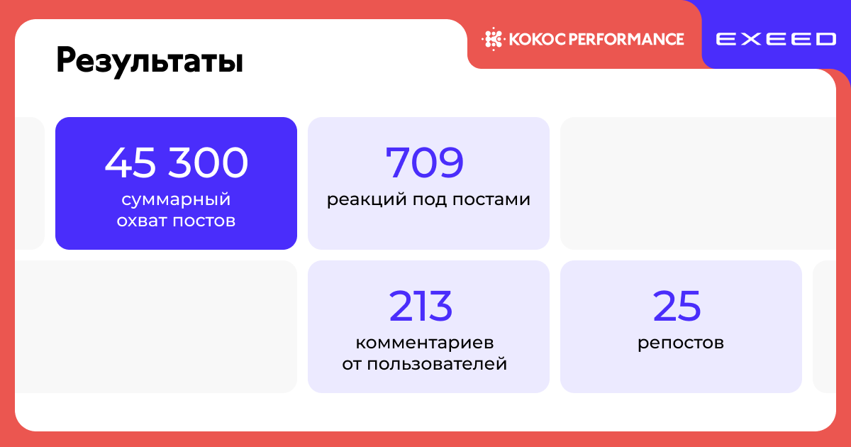 • 45,3 тыс. — суммарный охват постов в официальных сообществах автомобильного бренда («ВКонтакте» и «Телеграм»).