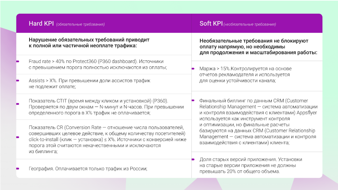 • сохранять объемы закупки без нарушения рекомендуемых маркеров эффективности (KPI) по Appsflyer;