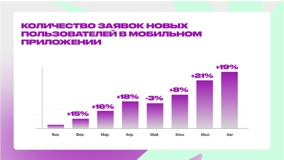 • Обеспечили ежемесячный стабильный рост — целевого события, отражающего реальные заявки новых пользователей в приложении.