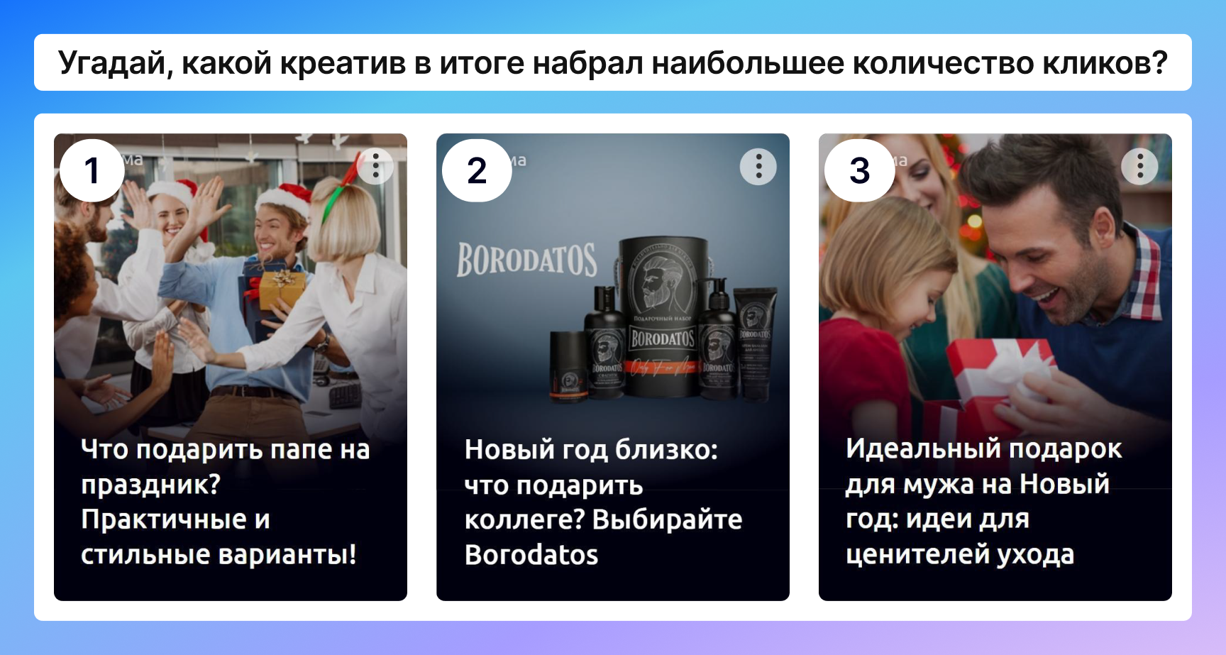 Однако это средние значения, на пиках у креативов были показатели в диапазоне 0,22–0,48%. Самые эффективные кейсы собрали ниже. Как думаете, какой из них показал наибольший CTR (Click-Through Rate — отношение числа кликов на рекламу к числу показов)?