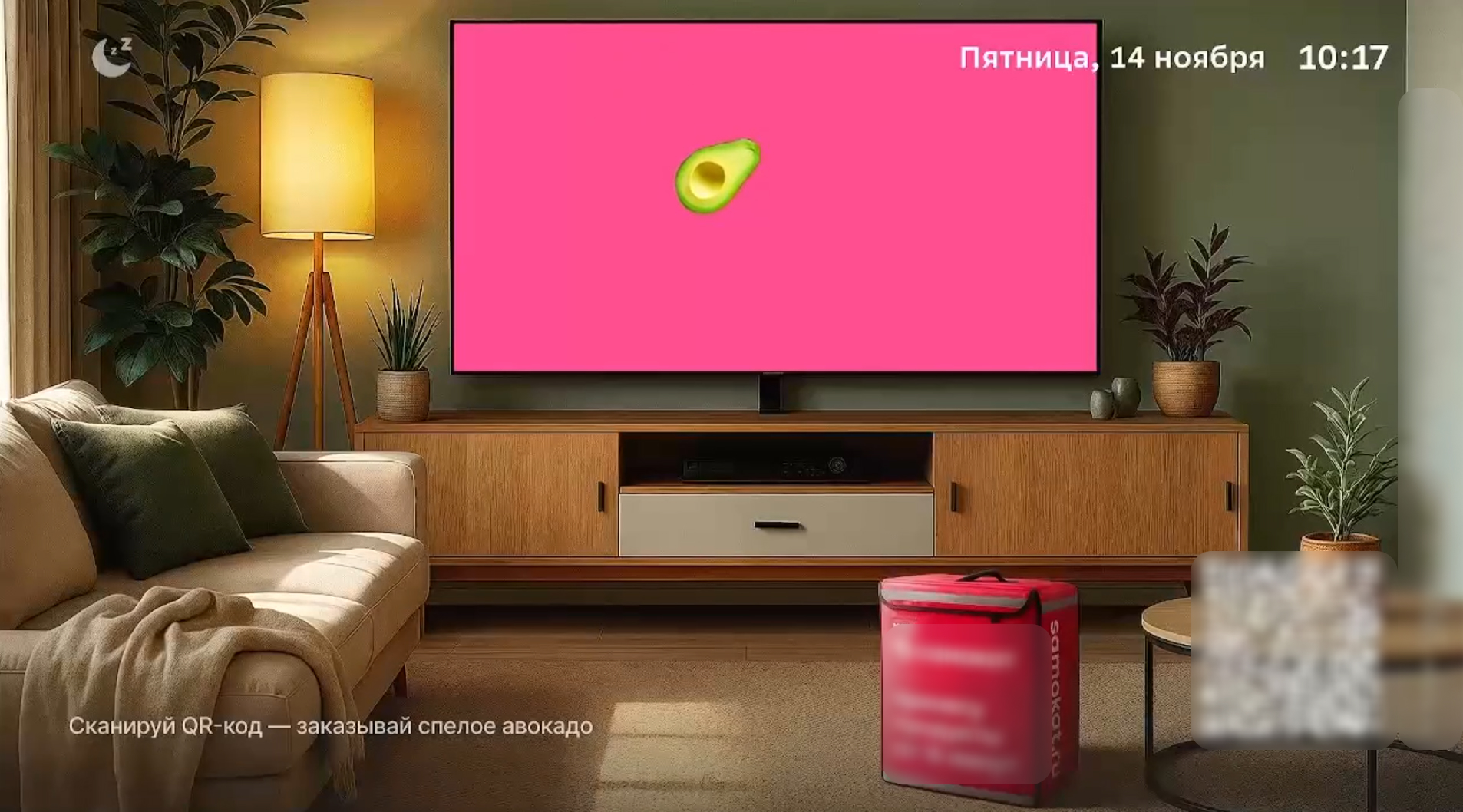 Как это работало: вместо логотипа DVD по экрану «летало» и отбивалось от краев авокадо в разных формах (целое, половинка, с косточкой). Каждый удар о рамку менял направление и форму фрукта. Фон и цветовое оформление отсылали к фирменному стилю Самоката, а текстовый хинт («сезон авокадо в самокате» или «надо-надо авокадо») закреплял сообщение. Поверх анимации был размещен заметный QR-код, ведущий сразу в приложение на карточку товара.
