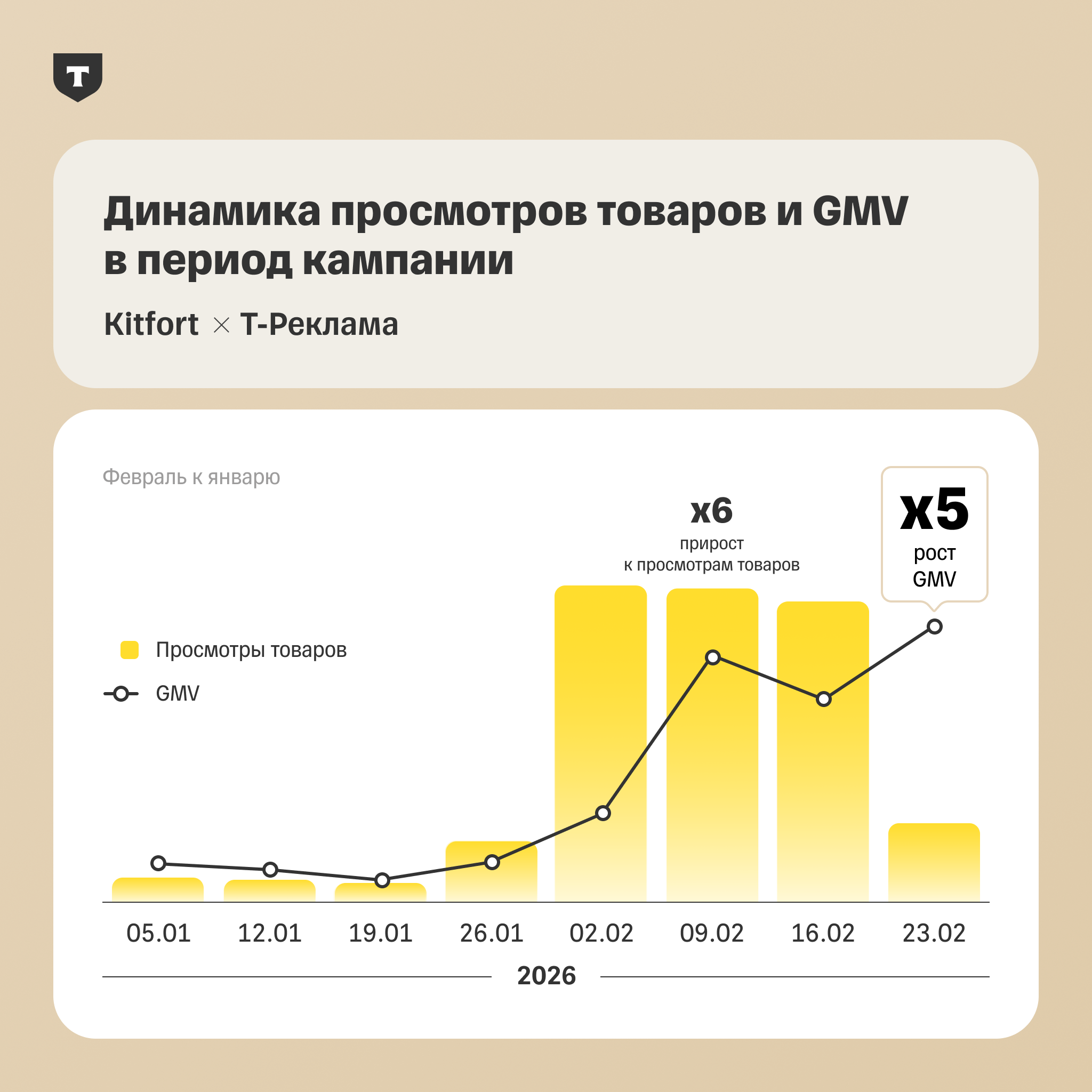 Уникальные просмотры товаров Kitfort в сервисе «Шопинг» в период проведения акции увеличились в 6 раз, а показатель масштаба бизнеса — GMV (Gross Merchandise Value или общий объем оборота товаров, то есть совокупная стоимость всех товаров и услуг, проданных через торговую платформу за определенный период) вырос в 5 раз за февраль относительно января.