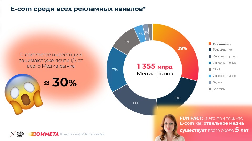 Суммарные вложения составили 900 млрд руб., что эквивалентно 63% всего российского рекламного рынка. При этом e-commerce как отдельное медианаправление существует всего около пяти лет, но уже сформировал почти треть (29%) общего медиарынка, который по итогам 2025 г. оценивается в 1,3 трлн руб.