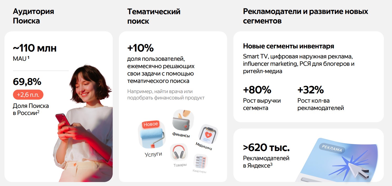 Помимо этого «Яндекс» привел данные по «Поиску». Ежемесячная аудитория сервиса составила около 110 млн активных пользователей с долей в России в 69,8% (+2,6 п. п.). Тематический поиск вырос на 10% по доле ежемесячных пользователей.