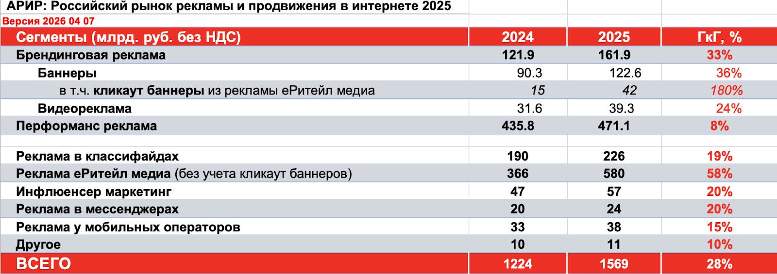Сильнее всего вырос рынок e-retail media ― на 58%, или до 580 млрд руб. Также высокую динамику показала брендинговая реклама, объем которой увеличился на 33% и достиг 161,9 млрд руб. Большую часть этого сегмента (122,6 млрд руб.) составили баннеры (рост на 36%). Объем видеорекламы увеличился на 24% и достиг 39,3 млрд руб.