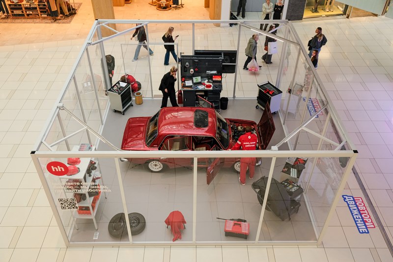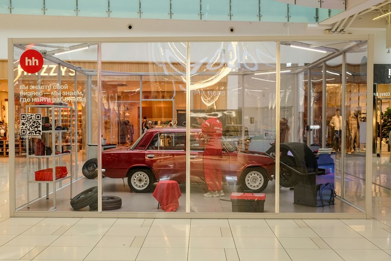 HeadHunter создал импровизированную автомастерскую в стеклянном кубе. Здесь посетители встретятся с реальными представителями рабочих специальностей и даже почувствовать себя в их роли.