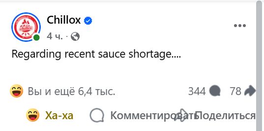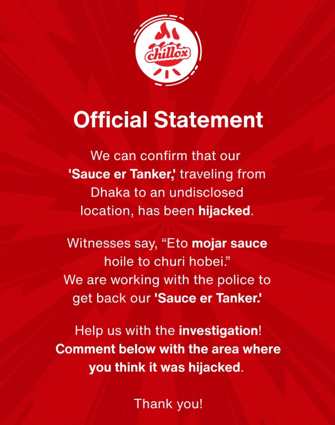 Официальное заявление Chillox (одна из самых известных и быстрорастущих сетей бургерных в Бангладеш): «Мы подтверждаем, что наш “Танкер с соусом” (Sauce er Tanker), направлявшийся из Дакки в неизвестном направлении, был захвачен. Свидетели говорят: “Если соус такой вкусный, его точно украдут” (Eto mojar sauce hoile to churi hobei). Мы работаем с полицией, чтобы вернуть наш “Танкер с соусом”. Помогите нам в расследовании! Напишите в комментариях ниже район, где, по вашему мнению, он был захвачен. Спасибо!»