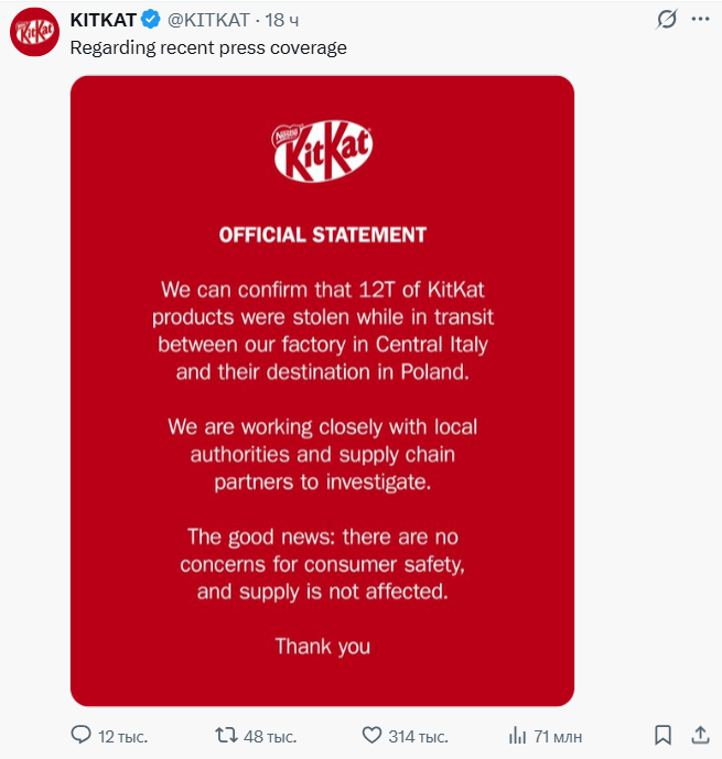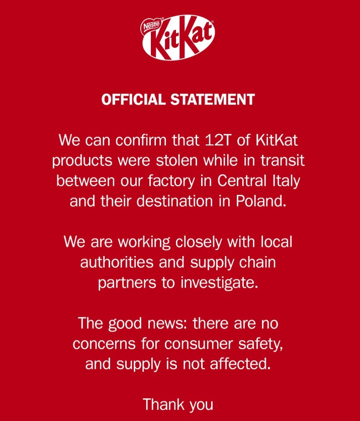 Перевод: «Мы можем подтвердить, что 12 тонн продукции KitKat были украдены во время транспортировки между нашей фабрикой в Центральной Италии и пунктом назначения в Польше. Мы тесно сотрудничаем с местными властями и партнерами по цепочке поставок для проведения расследования. Хорошие новости: причин для беспокойства о безопасности потребителей нет, и на поставках это не отразится. Благодарим вас».