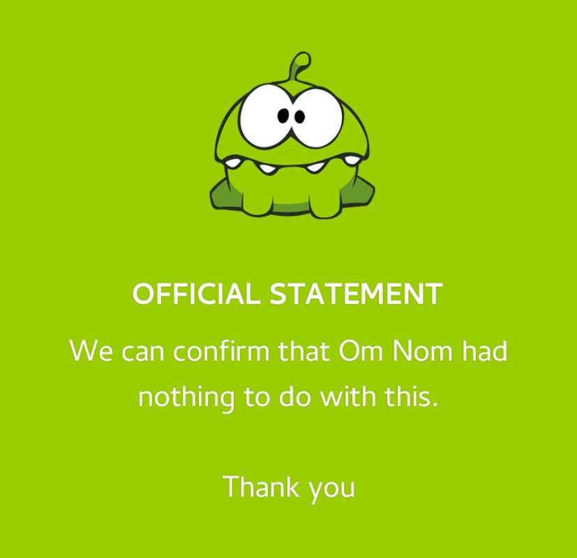 К флешмобу подключился даже главный поедатель сладостей в мире мобильных игр — Ам Ням (Om Nom) из игры Cut the Rope: «Мы можем подтвердить, что Ам Ням не имеет к этому никакого отношения. Спасибо».