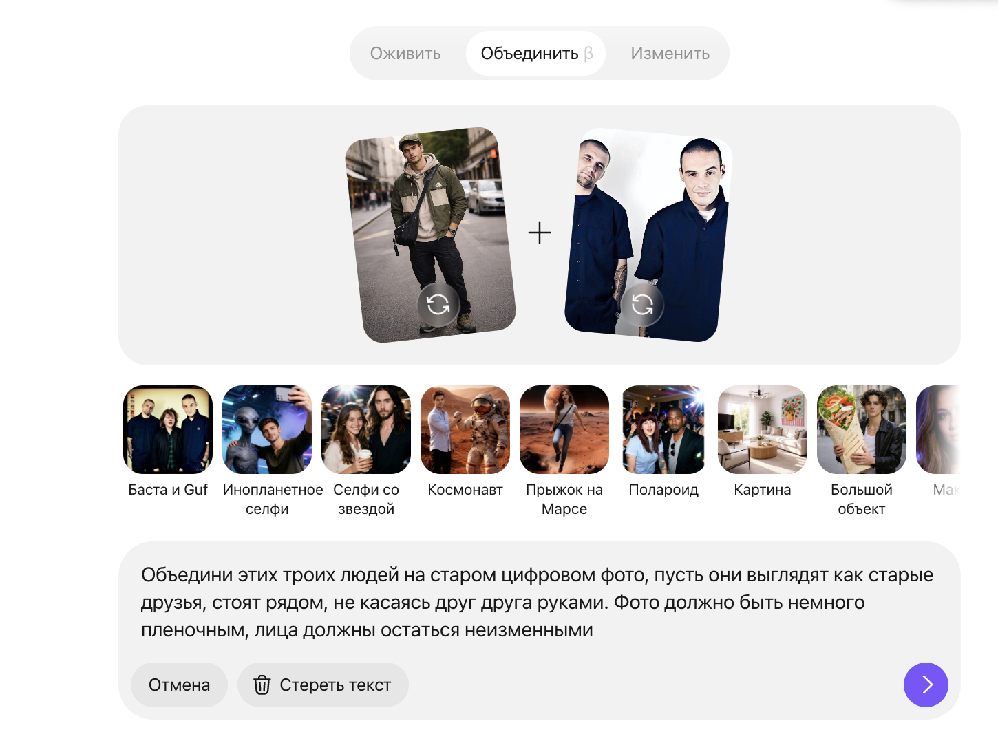 Рэперы выпустили авторский шаблон, соединяющий фотографии, в чате с «Алисой AI»