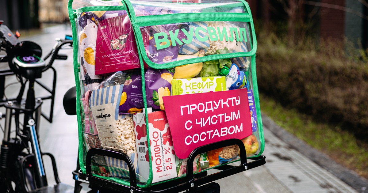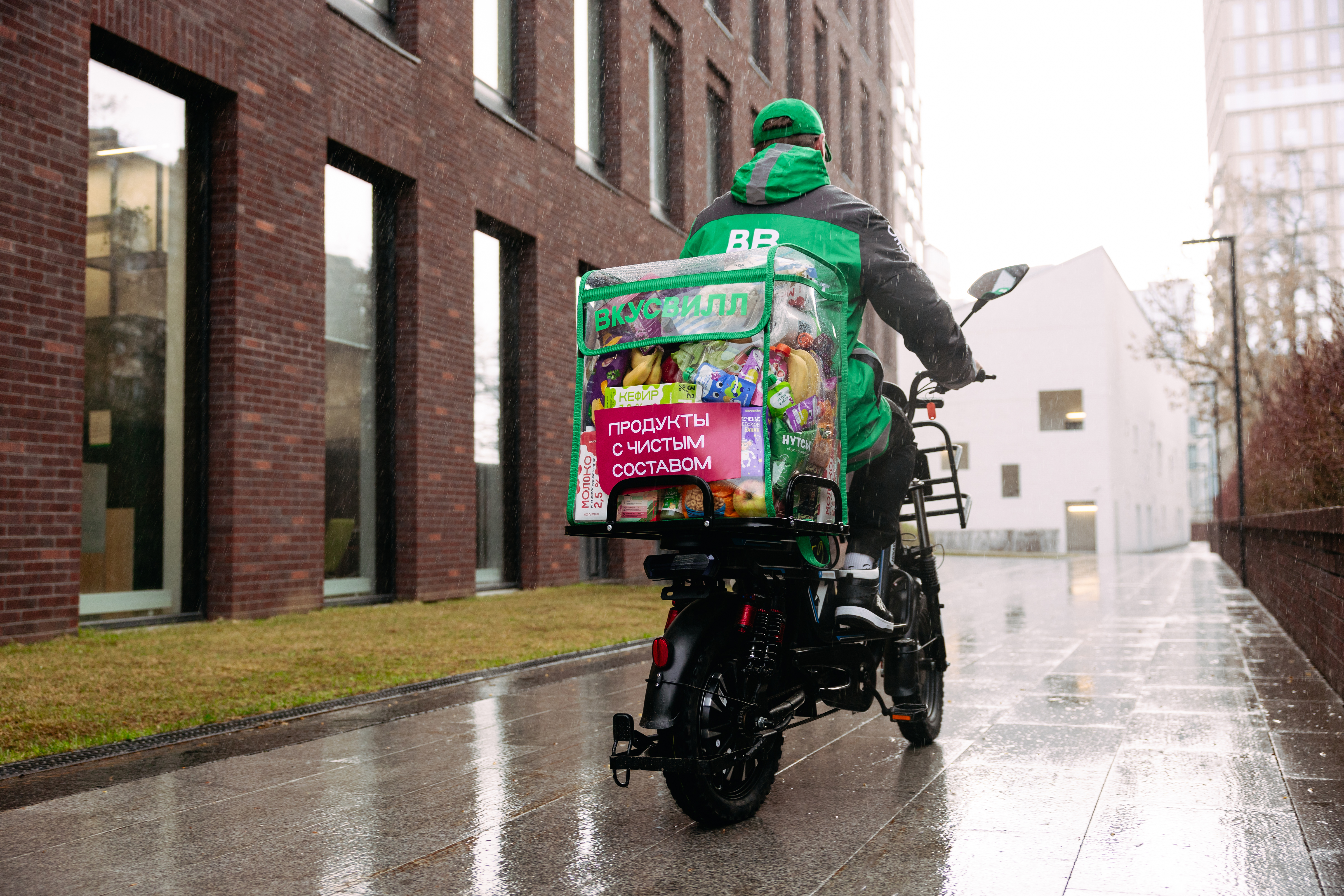 Курьер на транспорте с прозрачной сумкой. Фото: пресс-служба «ВкусВилла»