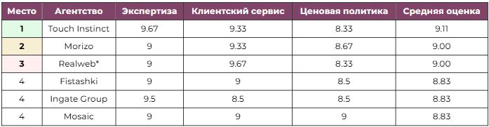 Компания Touch Instinct завоевала первое место и высокие оценки за экспертизу и клиентский сервис. На втором месте два агентства: Morizo и Realweb, оба за счет клиентского сервиса и экспертизы. Третье место сразу у трех участников - Fistashki, Ingate Group и Mosaic. Компании на трех верхних строчках смогли достичь средней оценки не менее 9 баллов.
