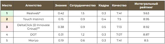 В интегральном рейтинге победило агентство Realweb благодаря высоким показателям знания и сотрудничества. На втором месте Touch Instinct за счет хорошего качества работы. Третье место досталось DeltaClick (D Innovate Group), у компании высокий кадровый рейтинг и неплохие показатели знания. Преодолеть отметку в 9 баллов сумел в этом году только лидер.