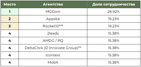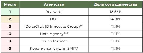 На первое место со значительным отрывом выходит агентство AMDG / RQ. Второе поделили между собой DOT и Rocket10. Показатели доли сотрудничества в целом немного снизились за год.