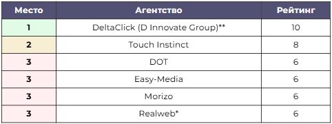 По количеству лучших специалистов, названных респондентами, на первом месте агентство DeltaClick (D Innovate Group). Там работает больше всего специалистов, которых участники опроса сочли высококвалифицированными.