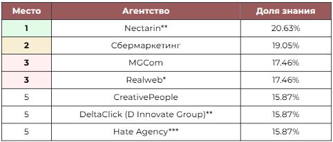 Доля знания у работающих в сегменте компаний по сравнению с прошлым годом снизилась, лишь лидер смог набрать более 20%. На первом месте агентство Nectarin, второе занял Сбермаркетинг, третье поделили между собой MGCom и Realweb.