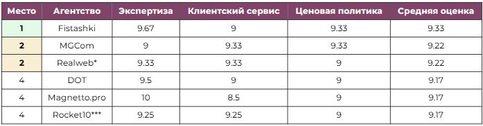Первое место в рейтинге качества досталось компании Fistashki, победить ей помогли высокие баллы за экспертизу и клиентский сервис. Второе место поделили между собой MGCom (благодаря хорошим оценкам за клиентский сервис и цены) и Realweb (за счет экспертизы и клиентского сервиса).