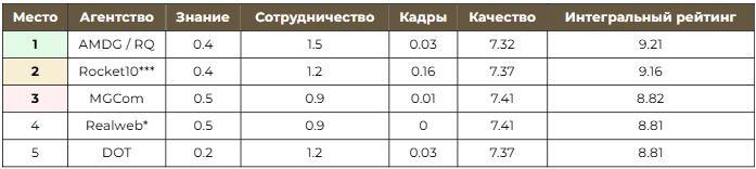 В интегральном рейтинге лидирует AMDG / RQ, победить агентству помогли высокие доли сотрудничества и знания. Затем следует Rocket10, компания опередила всех по кадровым показателям и показала неплохие баллы по остальным критериям. Третье место у MGCom благодаря высокому качеству работы. Итоговые результаты за год немного поднялись, и первые два лидера смогли превысить планку в 9 баллов.