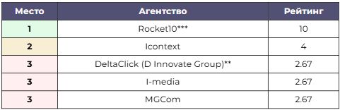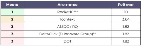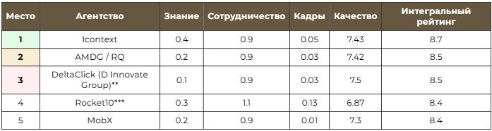 В интегральном рейтинге на первом месте компания Icontext благодаря достаточно хорошим баллам по всем параметрам. Второе место у AMDG / RQ, третье у DeltaClick (D Innovate Group). Итоговые результаты рейтинга у пятерки лидеров заметно ниже, чем в прошлом году.