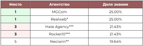 MGCom лидирует в рейтинге знания уже несколько лет подряд, в этом году компания поделила первое место с Realweb. Второе место у Hate Agency и Rocket10, третье у Nectarin. Доля знания у агентств за год немного снизилась, и ее значения выровнялись.