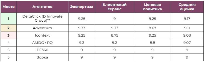 Лидеры рейтинга качества: DeltaClick (D Innovate Group), Adventum, Icontext.