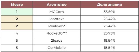 Первые три лидера рейтинга знания остались на своих прошлогодних местах. Первое место уже несколько лет подряд удерживает MGCom, Icontext расположился на втором месте, а Realweb — на третьем. Показатели знания за год в целом немного понизились, только лидер сумел набрать более 30%.