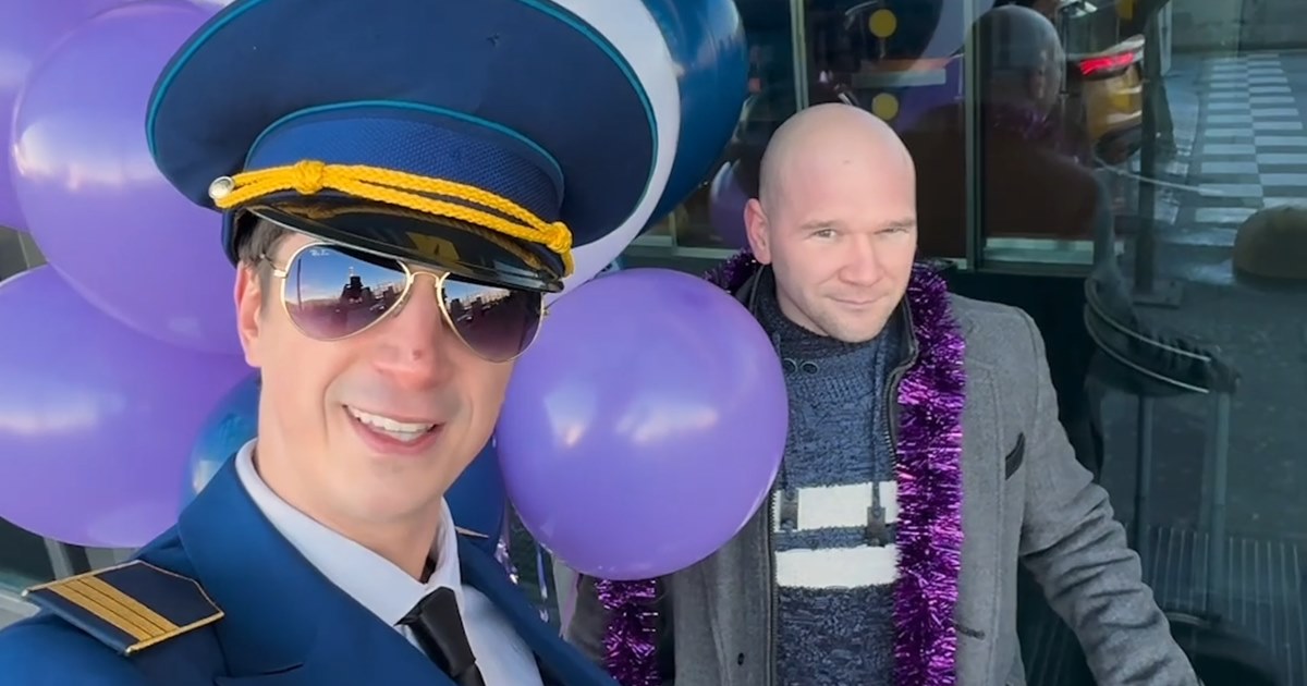 Блогер перевоплотился в образ пилота «Тутушных авиалиний» и вручил подарок юбиляру