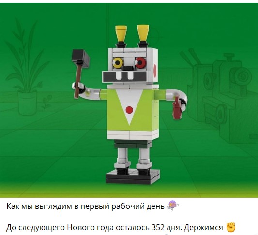 «Мир Кубиков» показал портрет типичного россиянина в офисе после новогодних праздников. Он будто собрал себя из силы воли, упорства и желания получить зарплату. А потом кое-как доковылял до офиса. Персонаж реальный. Это один из конструкторов кавер-версии мультфильма «Ну погоди!»