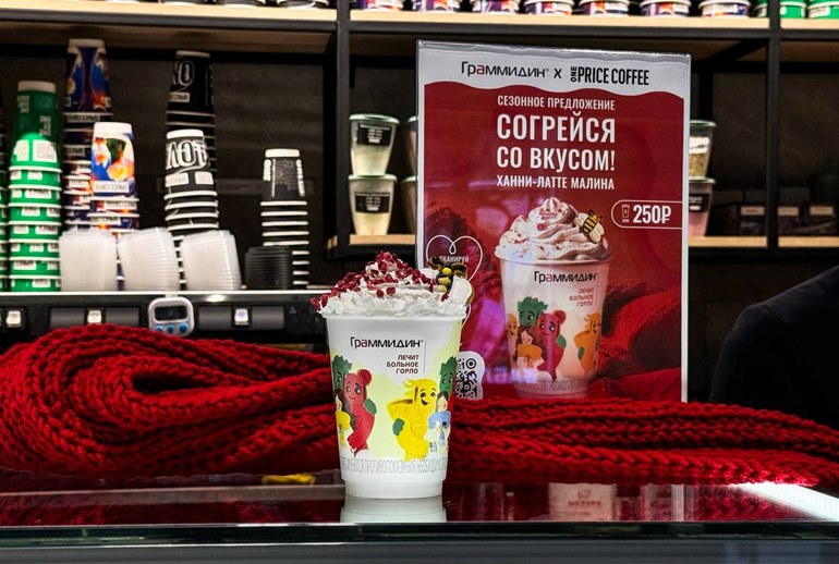 Современные реалии с регуляторными рамками заставляют бренды искать более мягкие пути. Так, например, «Граммидин» не стал снимать громкий ролик с новой звездой. Вместо этого он создал коллаборацию с сетью кофеен One Price Coffee и представил «оздоровительный» «Ханни-латте малина». На стаканчике расположился фирменный атрибут бренда, а по QR-коду — скидка на продукцию. Сообщение лишено прямых медицинских указаний, оно апеллирует к заботе, теплу и приятному моменту.