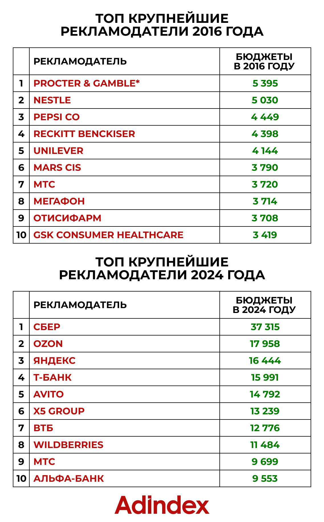 Контекст эпохи невозможно понять без цифр. В 2016 г. рекламный ландшафт определяли международные FMCG-гиганты, телеком-операторы и фармацевтические компании. Вот как выглядел топ-10 по расходам на рекламу в России, согласно рейтингу AdIndex.